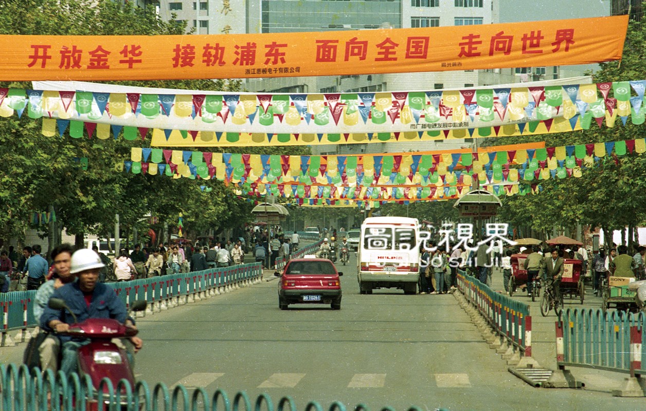 20210191-100、收藏作品、开放金华走向世界、道路护栏、马路、汽车、摩托车、横幅